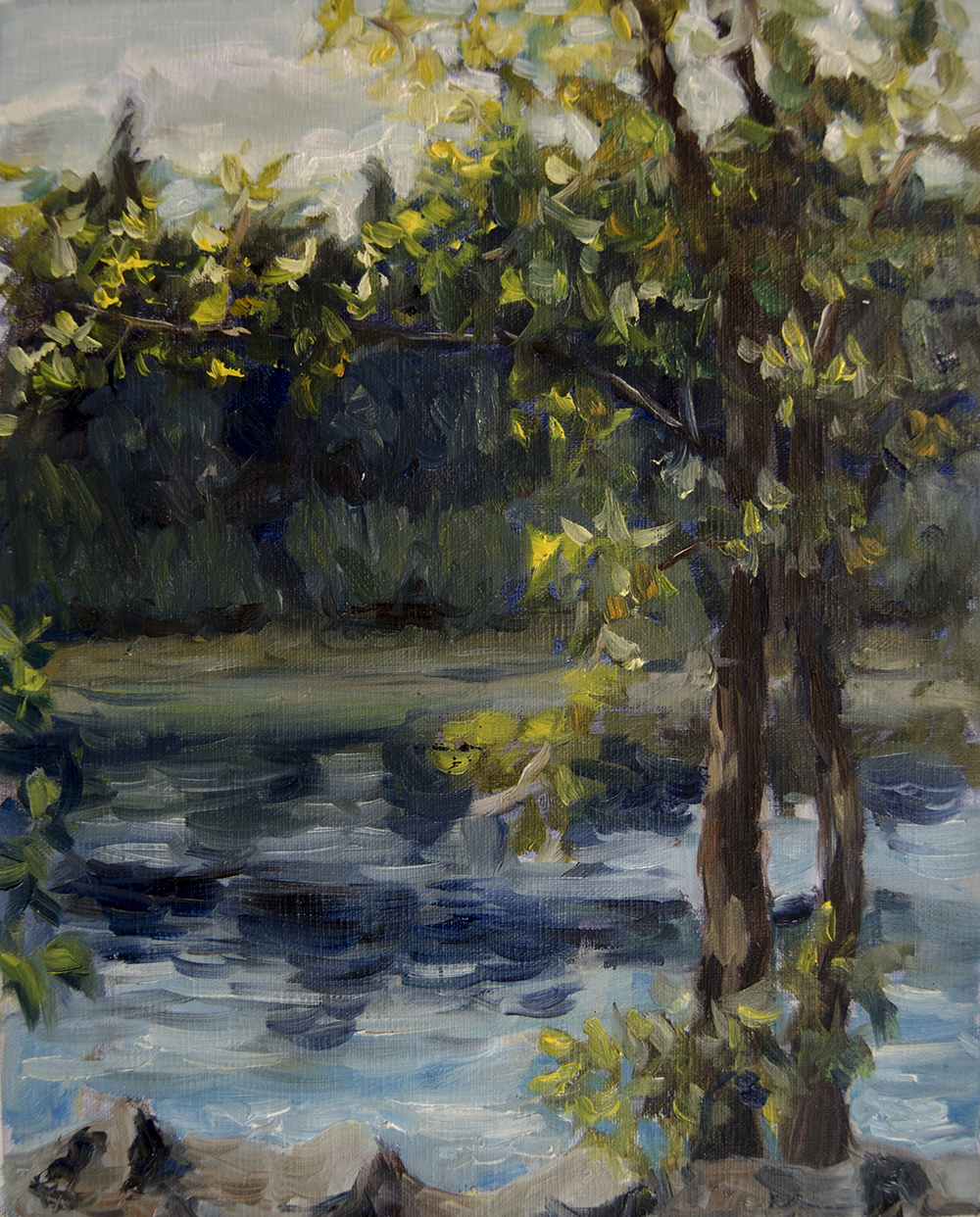 While others in my family were busy, I was able to get away to paint this scene along a river. Â It was a bright day and I experimented with my underpainting.