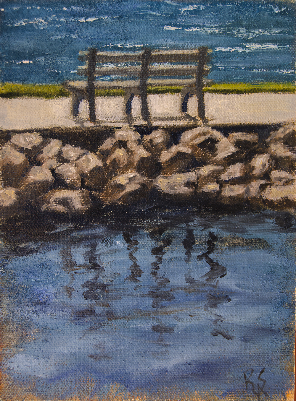 It was a blazing afternoon and the different surfaces on the water drew my attention. Â This lonely bench caught my eye.