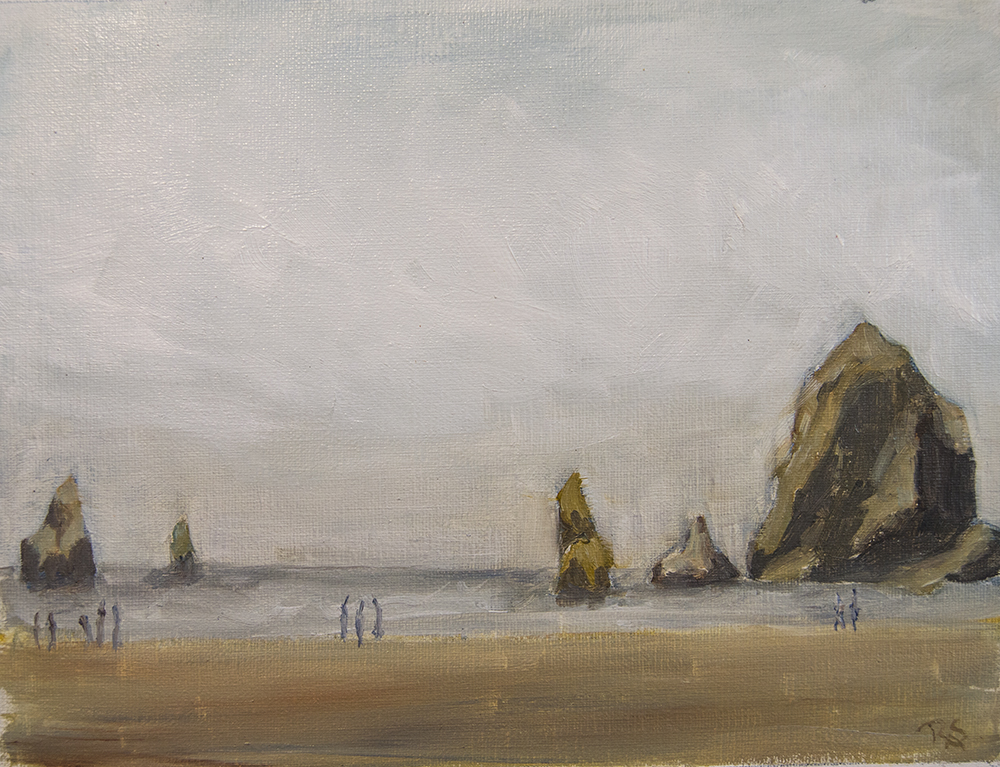 It was raining when we got to the coast. Â The wind was blowing and it was a little cold. Â I walked along until I got close enough to the Haystack to paint the scene. Â