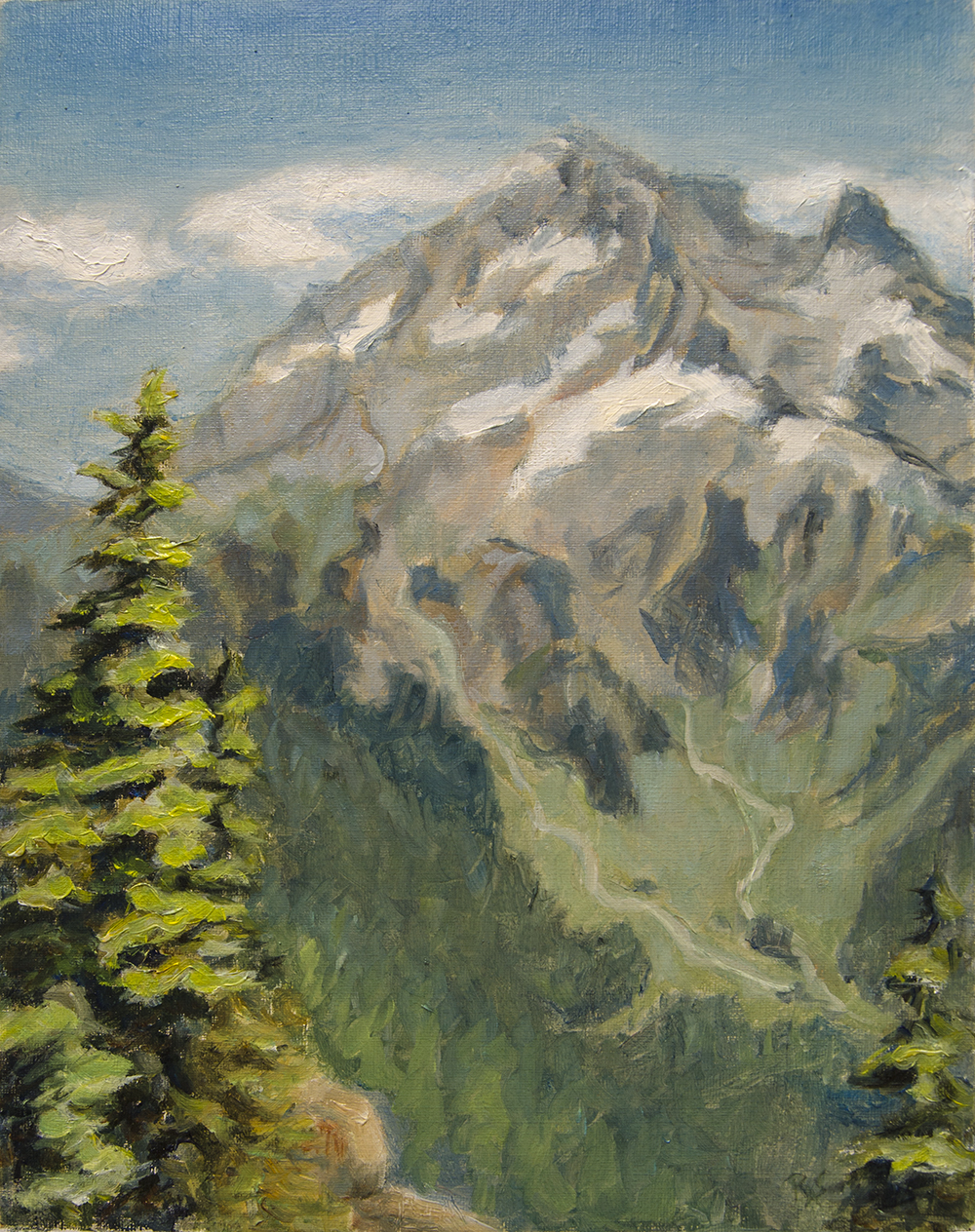We hiked up Mt. Baker to a plateau with a vista of Mt. Hood. I was able to prop my art box on a fallen log. I was fascinated by the size of the vertical drop in front of me. On the hike down the sun was at the right angle to make the forest seem magical. The trees had a beautiful glow that you could feel in the air.