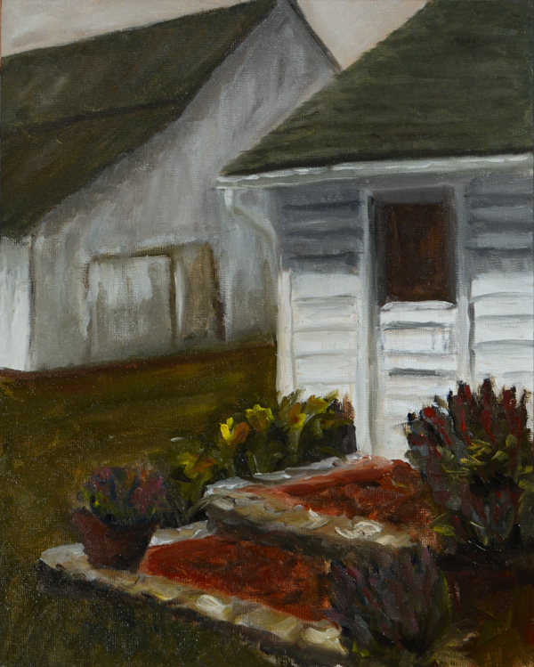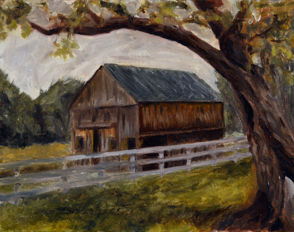 I enjoyed painting the twisted leaning tree and the colors in the wood of the barn in Amish Barn, the first painting. Â In the latter painting, I was attracted to the shades of whites in the garage, barn, and sky.