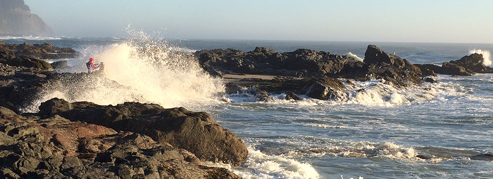 I do not get to visit the ocean very often, due to living in the midwest. Â I thought that a tide would come in slowly and that their would be warning waves that might hit my feet while I painted standing on a large rock. Â I thought wrong. Â There was no warning for this wave that washed over me and my painting gear. Â My husband was nice enough to see the wave coming and take a picture rather than warn me.